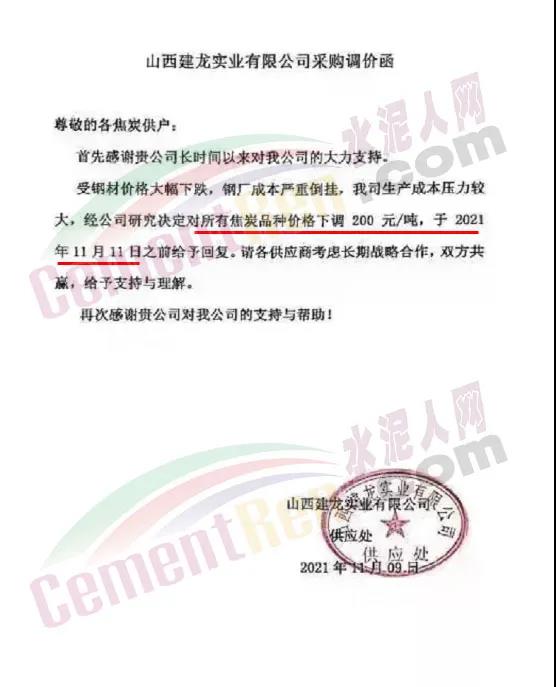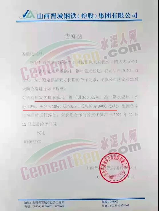 山西晉城鋼鐵控股集團有限公司告知函稱,由于鋼材成本嚴重倒掛,鋼材需求低迷,企業(yè)生產(chǎn)成本壓力較大。為了穩(wěn)定供需雙方長期的合作關系,企業(yè)決定對焦炭采購價格進行調整。對所有焦炭含稅承兌出廠價下調200元/噸。
