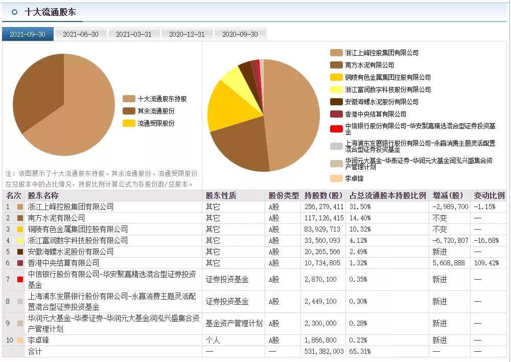 上峰水泥三季報(bào)顯示,海螺水泥在今年第三季度新進(jìn)成為公司第5大股東,持股比例為2.49%。
