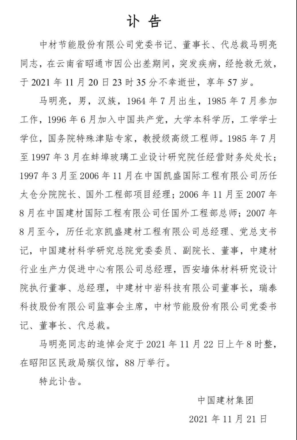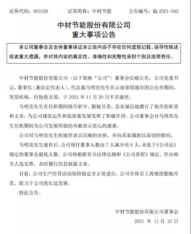 11月21日中國建材集團(tuán)發(fā)布訃告稱,中材節(jié)能股份有限公司黨委書記、董事長、代總裁馬明亮同志,在云南省昭通市因公出差期間,突發(fā)疾病,經(jīng)搶救無效,于2021年11月20日23時35分不幸逝世,享年57歲。