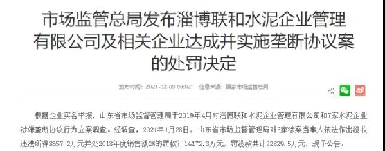 據(jù)了解,今年2月9日國(guó)家市場(chǎng)監(jiān)督管理總局反壟斷局發(fā)布淄博聯(lián)合水泥企業(yè)管理有限公司及相關(guān)企業(yè)達(dá)成并實(shí)施壟斷協(xié)議案的處罰決定。2021年1月28日,山東省市場(chǎng)監(jiān)督管理局對(duì)8家涉案當(dāng)事人依法作出沒(méi)收違法所得8657.2萬(wàn)元并處2018年度銷售額2%的罰款計(jì)14172.3萬(wàn)元,罰沒(méi)款共計(jì)22829.5萬(wàn)元。