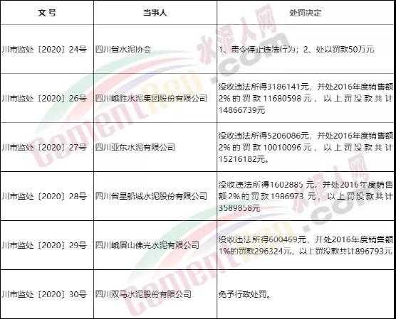 四川省市場(chǎng)監(jiān)督管理局發(fā)布6條《行政處罰決定書》。其中針對(duì)于當(dāng)?shù)厮嘈袠I(yè)的處罰決定書提到案件來(lái)源及調(diào)查經(jīng)過(guò)為:2017年7月,四川省發(fā)展和改革委員會(huì)從多個(gè)途徑收到反映四川省水泥協(xié)會(huì)組織本行業(yè)經(jīng)營(yíng)者聯(lián)合漲價(jià)的舉報(bào)。經(jīng)初步核查后,四川省發(fā)展和改革委員會(huì)于2017年7月20日正式對(duì)四川省水泥協(xié)會(huì)及涉嫌達(dá)成并實(shí)施壟斷協(xié)議的六家水泥經(jīng)營(yíng)者予以立案調(diào)查,總計(jì)處罰3506.9572萬(wàn)元。
