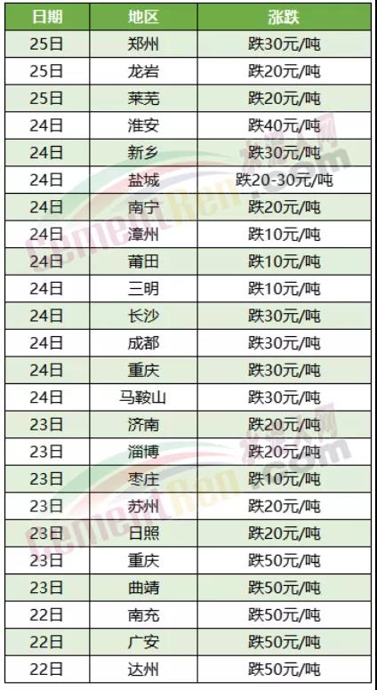 川渝地區(qū)大氣污染防控,環(huán)保管制加嚴(yán),加上一些項目因資金緊張,水泥市場需求低迷。各企業(yè)庫存高位運(yùn)行。同時遭遇外來低價水泥沖擊,競爭加劇。區(qū)域主要品牌企業(yè)陸續(xù)通知下調(diào)水泥價格,其中重慶、達(dá)州、廣安、南充以及云南曲靖等多地水泥價格跌50-80元/噸。重慶區(qū)域23、24日連續(xù)兩次下調(diào)水泥價格,累計下跌50-80元/噸,絕大多數(shù)企業(yè)下調(diào)金額在20-30元/噸之間。