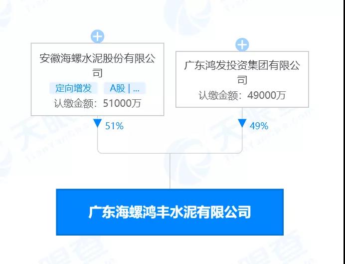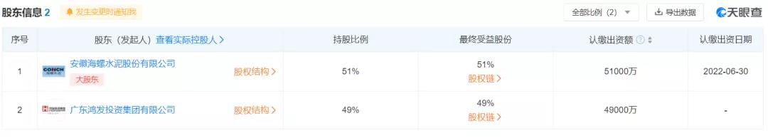 2021年11月26日廣東海螺鴻豐水泥有限公司成立,注冊(cè)資本10億人民幣。企業(yè)股東信息顯示,安徽海螺水泥作為合資企業(yè)大股東,持股51%,認(rèn)繳出資額為51000萬(wàn),認(rèn)繳出資日期為2022年6月30日;廣東鴻發(fā)投資集團(tuán)有限公司持股49%,認(rèn)繳出資額49000萬(wàn)。