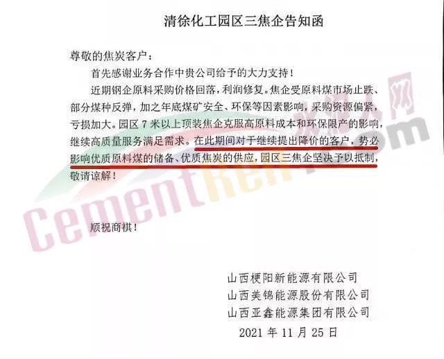 近日,一份名為《清徐化工園區(qū)三焦企告知函》的文件在網絡流傳。署名為山西梗陽新能源、山西亞鑫能源,以及A股上市公司美錦能源的三家焦化企業(yè)表示,若焦炭客戶繼續(xù)提降,勢必影響優(yōu)質原料煤的儲備、優(yōu)質焦炭的供應,將堅決予以抵制。
