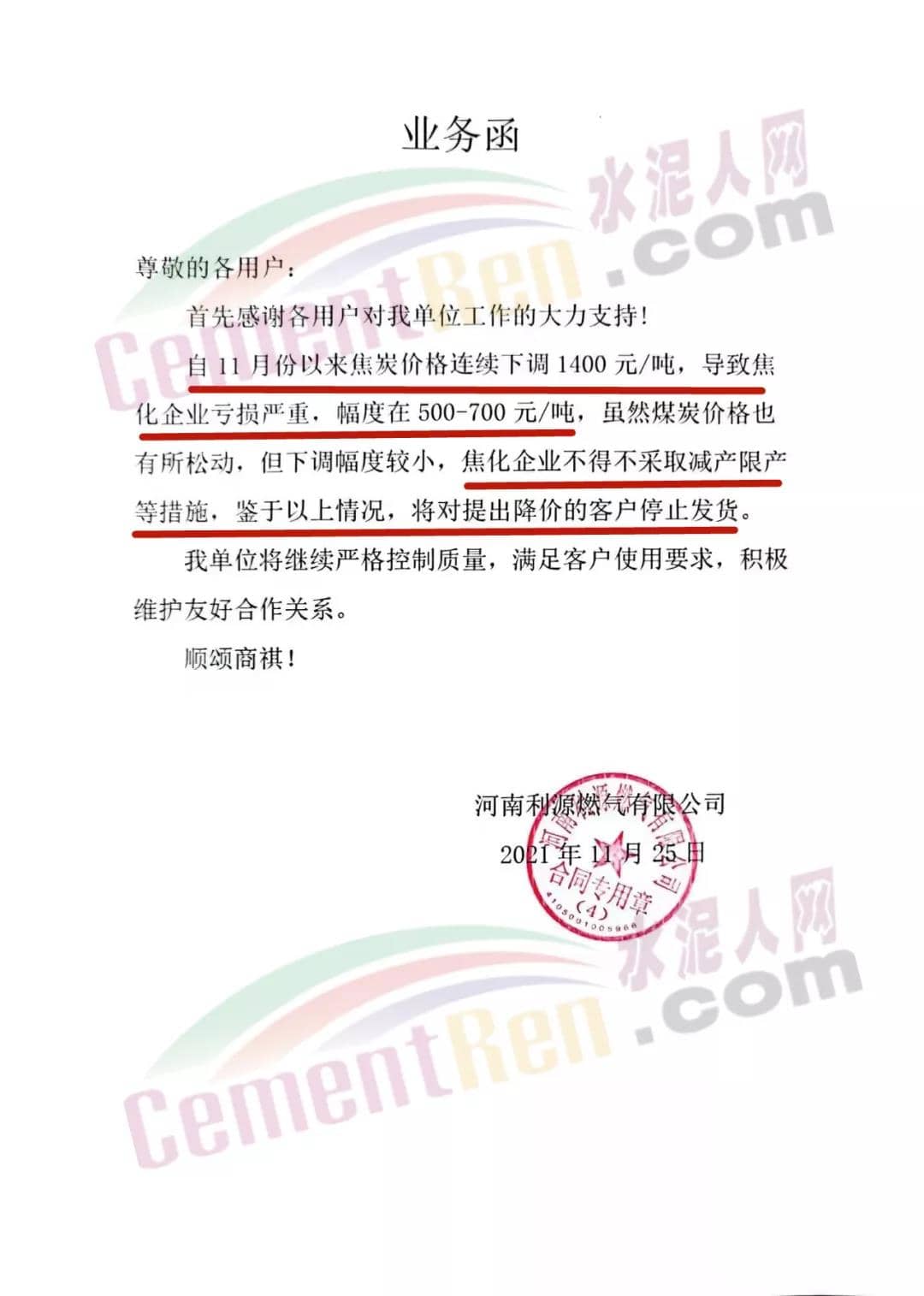 告知函中提到,近期鋼企(下游客戶)原料采購價格回落,利潤修復,與此同時,焦企(原料供應商)受原料煤市場止跌、部分煤種反彈等因素影響,虧損加大,因此堅決抵制降價。據水泥人網了解,近期發(fā)出這類告知函的企業(yè)不在少數,有些企業(yè)甚至明確,對于繼續(xù)提出降價的客戶停止發(fā)貨。