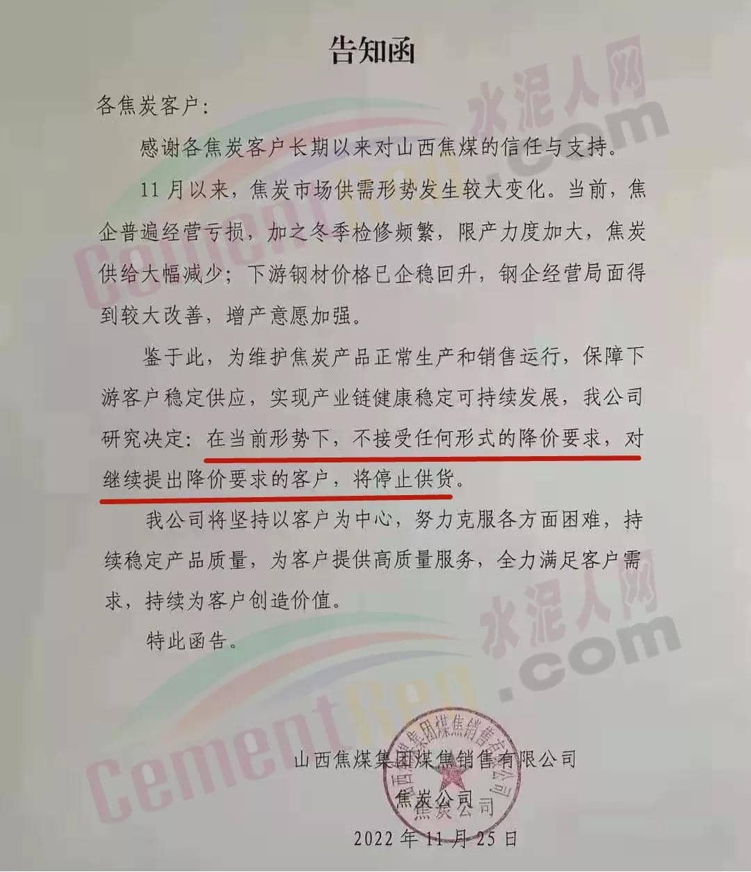 山西焦煤集團煤焦銷售有限公司:為維護焦炭產品正常生產和銷售運行,保障下游客戶穩(wěn)定供應,實現產業(yè)鏈健康穩(wěn)定可持續(xù)發(fā)展,研究決定:在當前形勢下,不接受任何形式的降價要求,對繼續(xù)提出降價要求的客戶,將停止供貨。