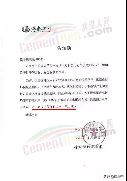 山西鵬飛集團:為了煤焦鋼產業(yè)鏈均衡可持續(xù)發(fā)展,更好地保證合作客戶長期穩(wěn)定供應,經集團公司研究決定:對一切提出降價的客戶,停止供貨。