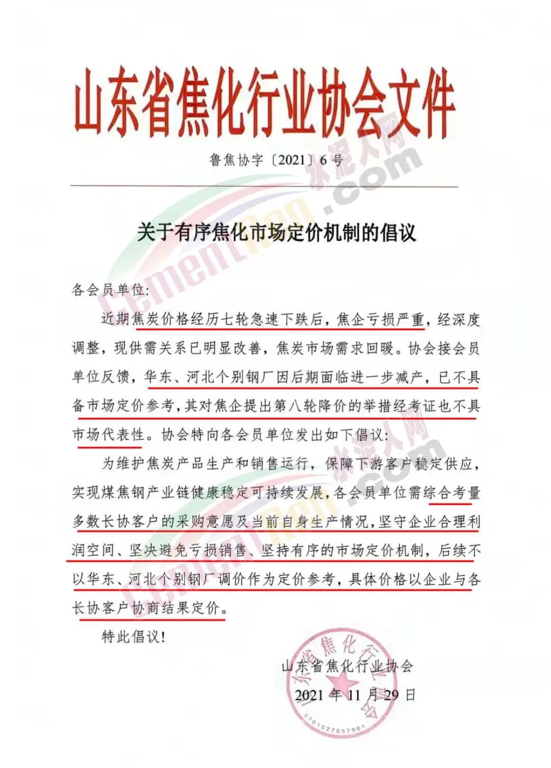 山東省焦化行業(yè)協會發(fā)出倡議文件稱,近期焦炭價格經歷七輪急速下跌后,焦企虧損嚴重,經深度調整,現供需關系已明顯改善,焦炭市場需求回暖。協會接會員單位反饋,華東、河北個別鋼廠因后期面臨進一步減產,已不具備市場定價參考,其對焦企提出第八輪降價的舉措經考證也不具市場代表性。協會特向各會員單位發(fā)出倡議∶