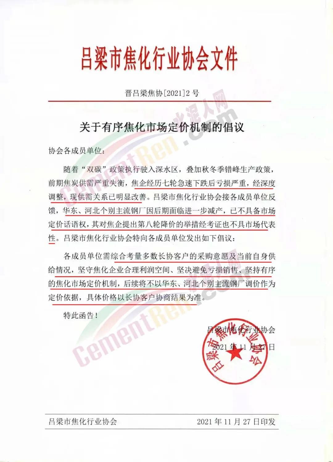 呂梁市焦化行業(yè)協會發(fā)布《關于有序焦化市場定價機制的倡議》稱,隨著"雙碳"政策執(zhí)行駛入深水區(qū),疊加秋冬季錯峰生產政策,前期焦炭供需嚴重失衡,焦企經歷七輪急速下跌后虧損嚴重,經深度調整,現供需關系已明顯改善。呂梁市焦化行業(yè)協會接各成員單位反饋,華東、河北個別主流鋼廠因后期面臨進一步減產,已不具備市場定價話語權,其對焦企提出第八輪降價的舉措經考證也不具市場代表性。