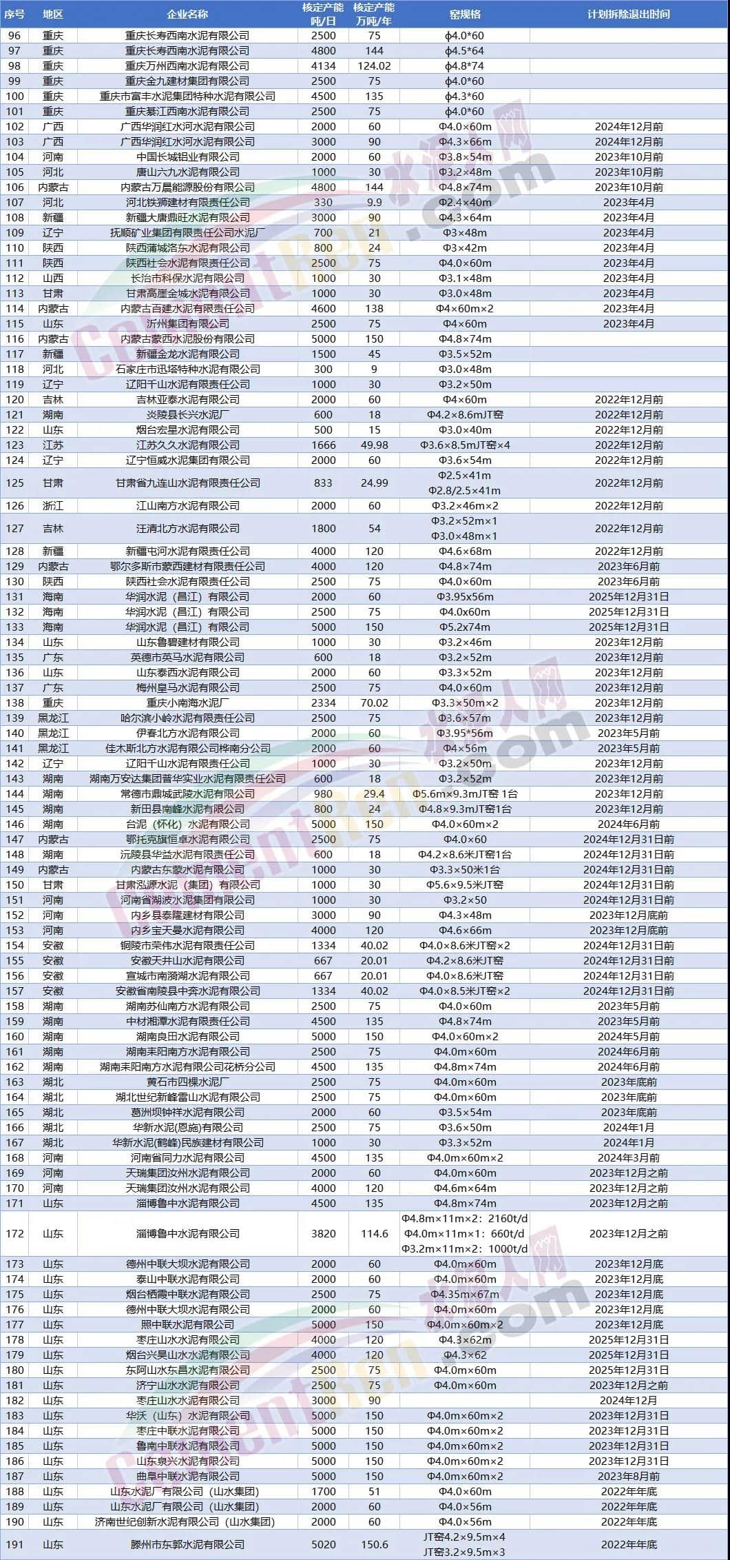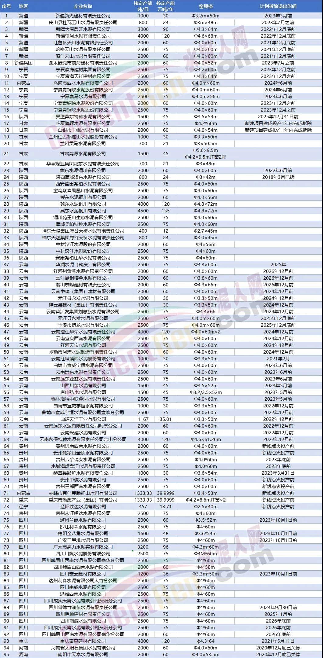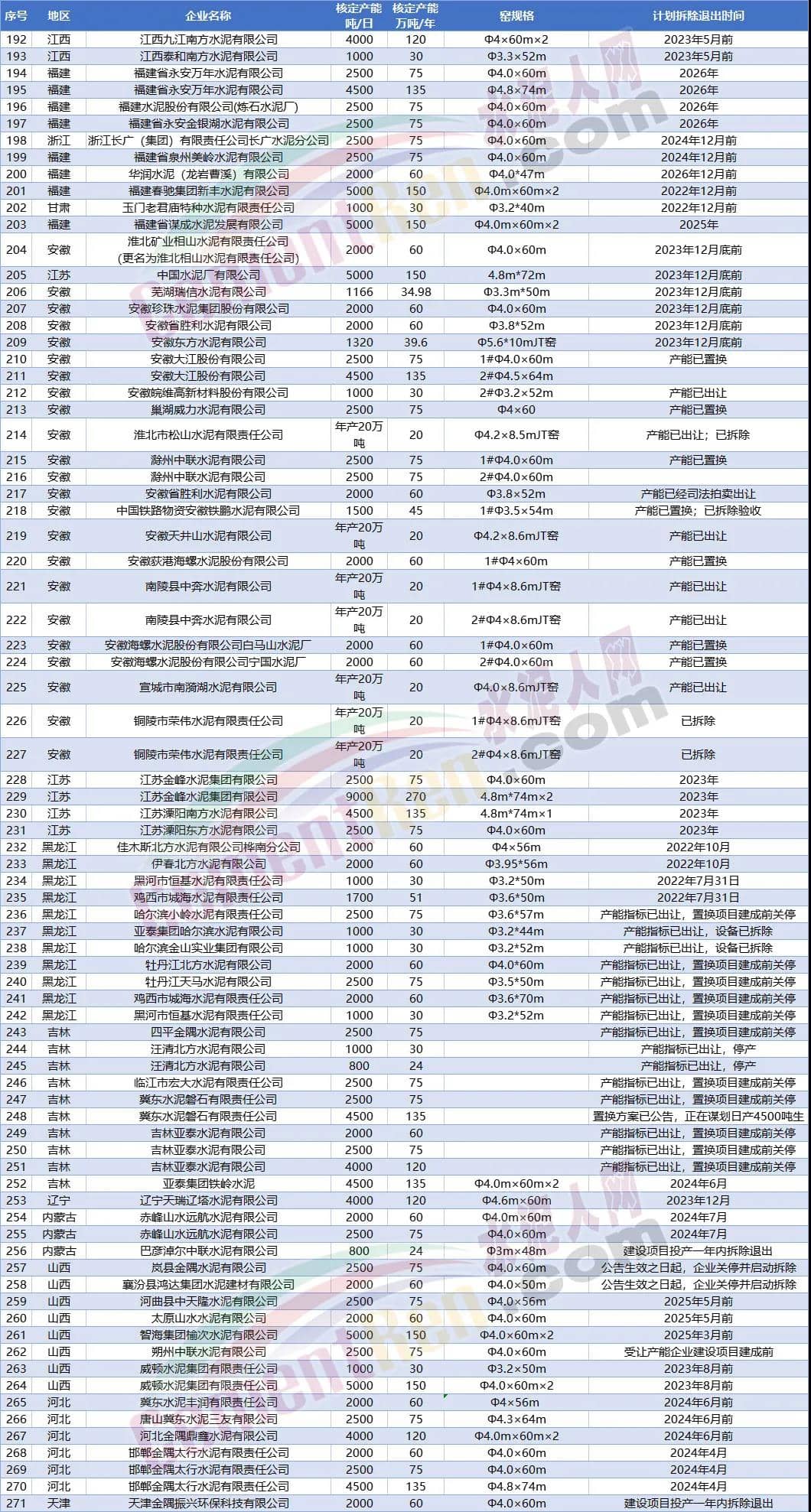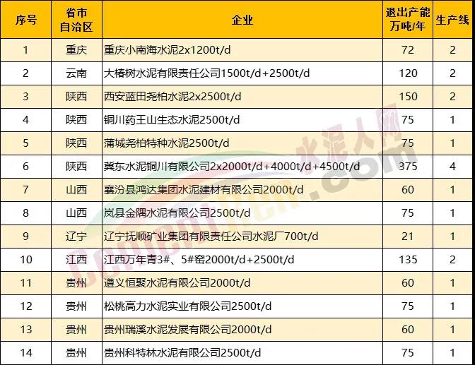 另據(jù)水泥人網(wǎng)不完全統(tǒng)計今年以來已經(jīng)有20多條水泥熟料生產(chǎn)線發(fā)布關(guān)停拆除消息。涉及陜西 、貴州、山西、江西、云南、重慶、遼寧7個省市自治區(qū)合計14個項目21條生產(chǎn)線。退出產(chǎn)能合計1428萬噸/年。其中包括冀東水泥銅川有限公司4條熟料生產(chǎn)線,退出產(chǎn)能達375萬噸/年,以及重慶小南海水泥72萬噸/年熟料產(chǎn)能。