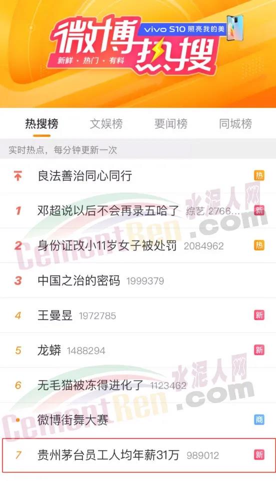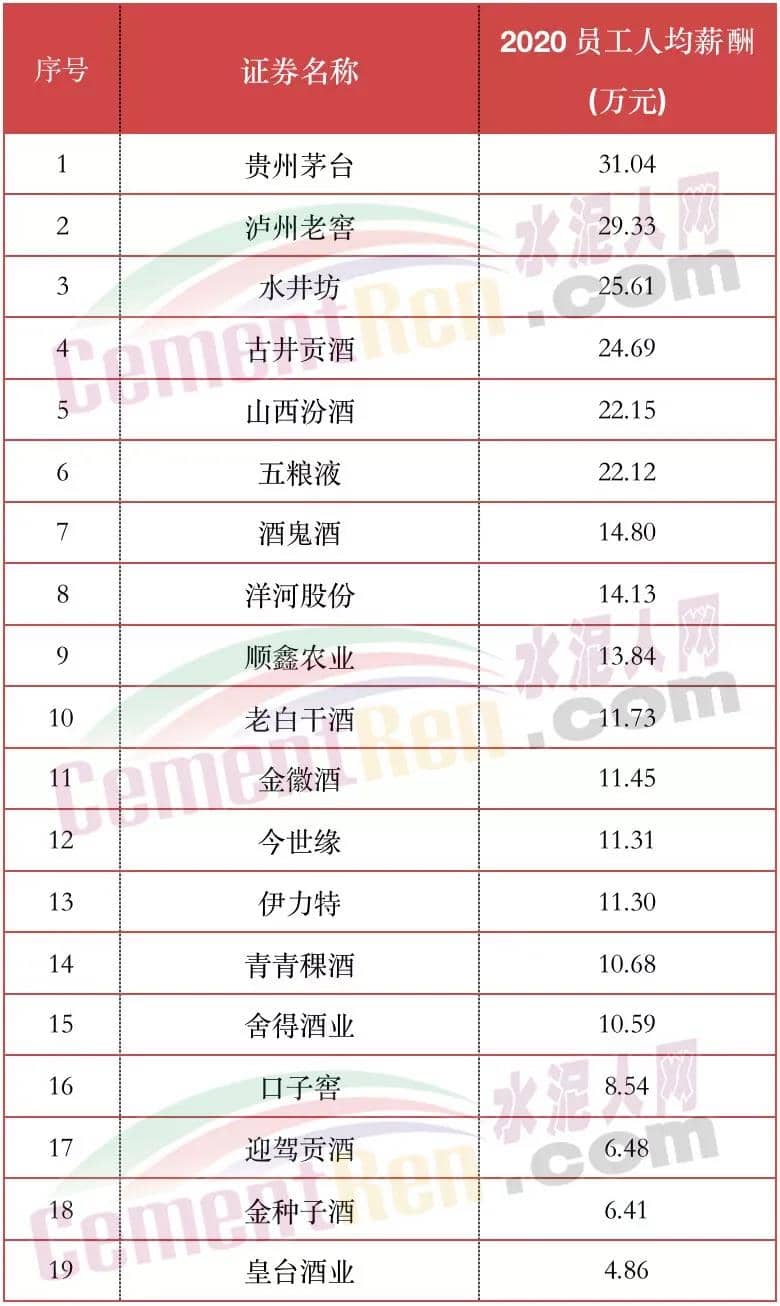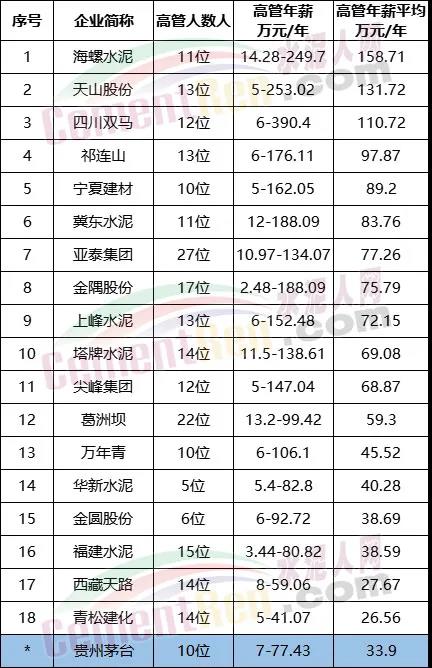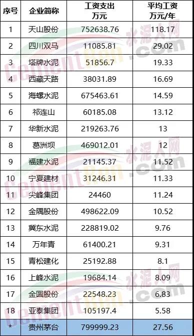對(duì)比上市公司最新公布的水泥行業(yè)高管年薪及員工平均薪酬,水泥行業(yè)18家上市公司,海螺水泥以高管年薪平均158.71萬(wàn)元/年位于首位,天山股份員工年薪平均131.72萬(wàn)元/年位于第二位。按最新公布數(shù)據(jù)計(jì)算,海螺水泥高管平均年薪較貴州茅臺(tái)高出124.81萬(wàn)元/年,員工平均工資卻低出12.97萬(wàn)元/年。