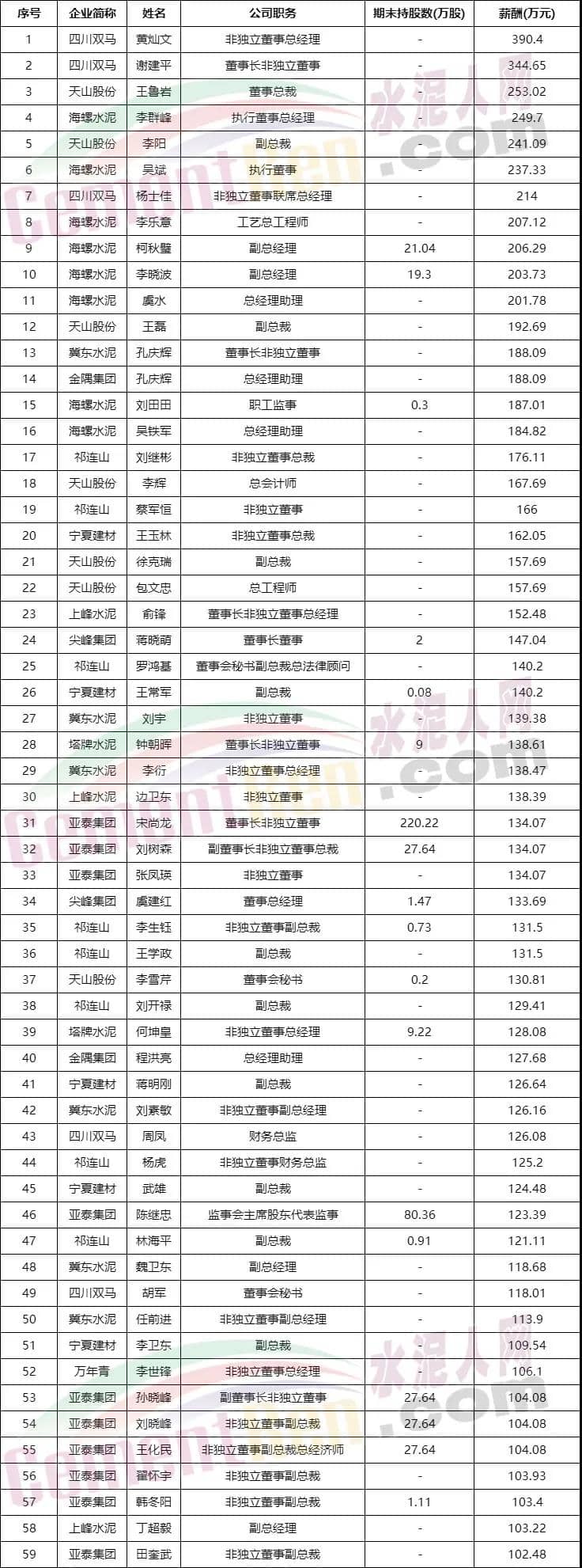 從最新公布的高管年薪數(shù)據(jù)來(lái)看,四川雙馬董事長(zhǎng)黃燦文和總經(jīng)理謝建平分列高管年薪第一位和第二位,分別為390.4萬(wàn)元和344.65萬(wàn)元;第三位天山股份董事總裁王魯巖年薪253.2萬(wàn)元;海螺水泥執(zhí)行董事總經(jīng)理年薪249.70萬(wàn)元位于第四位。