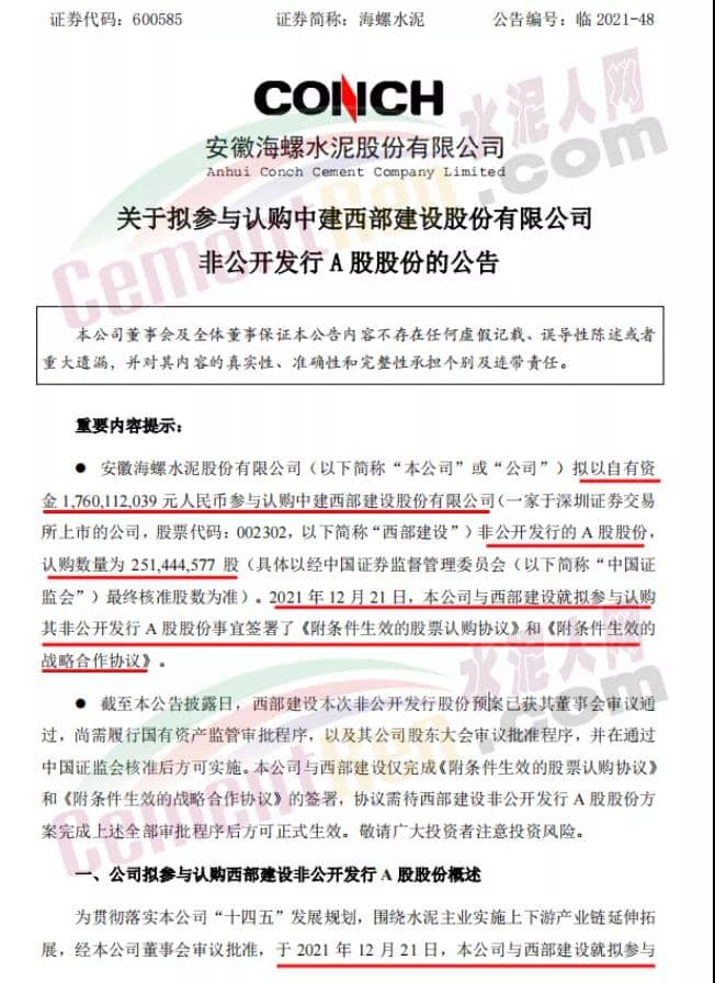 海螺水泥公告稱,為貫徹落實本公司“十四五”發(fā)展規(guī)劃,圍繞水泥主業(yè)實施上下游產(chǎn)業(yè)鏈延伸拓展,經(jīng)本公司董事會審議批準(zhǔn),于2021年12月21日,本公司與西部建設(shè)就擬參與認(rèn)購其非公開發(fā)行股份事宜簽署了《附條件生效的股票認(rèn)購協(xié)議》和《附條件生效的戰(zhàn)略合作協(xié)議》。西部建設(shè)是國內(nèi)領(lǐng)先的建材產(chǎn)業(yè)綜合服務(wù)商,也是國內(nèi)商品混凝土行業(yè)的領(lǐng)軍企業(yè),本公司擬通過認(rèn)購其非公開發(fā)行A股股份的方式,進(jìn)一步加強雙方在原材料供銷、混凝土業(yè)務(wù)、砂石骨料業(yè)務(wù)、物流運輸、產(chǎn)業(yè)互聯(lián)網(wǎng)等方面的戰(zhàn)略合作。