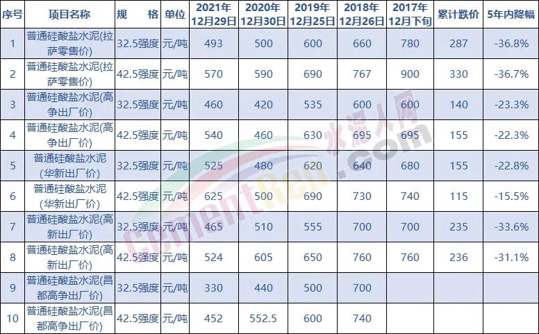 據(jù)查詢,自2017年12月以來,西藏拉薩區(qū)域水泥價格出現(xiàn)持續(xù)下跌,5年內(nèi)降幅15.5~36.8%。其中42.5標(biāo)號普通硅酸鹽水泥(拉薩零售價)從2017年12月份的900元/噸,跌至2021年12月29日的570元/噸,累計跌價達330元/噸,跌幅36.7%。