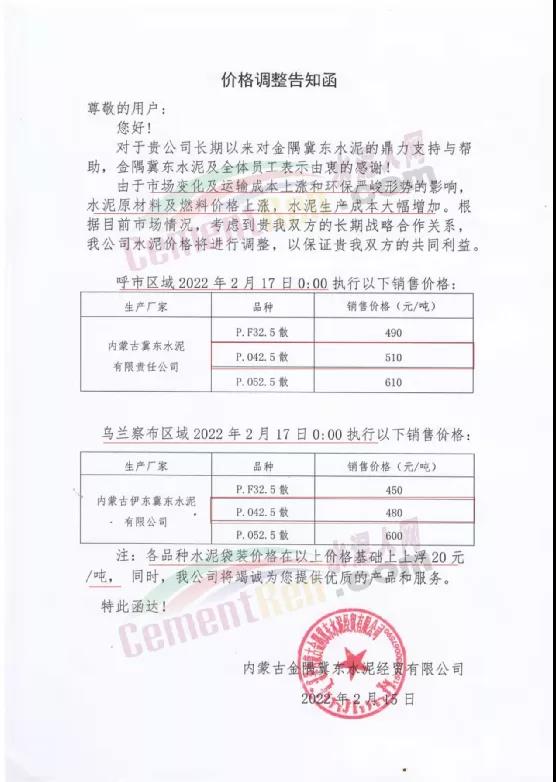 日前,內(nèi)蒙古金隅冀東水泥經(jīng)貿(mào)有限公司發(fā)布《價(jià)格調(diào)整告知函》稱,由于市場(chǎng)變化及運(yùn)輸成本上漲和環(huán)保嚴(yán)峻形勢(shì)的影響,水泥原材料及燃料價(jià)格上漲,水泥生產(chǎn)成本大幅增加。根據(jù)目前市場(chǎng)情況,上調(diào)公司水泥價(jià)格。呼市區(qū)域自2月17日0時(shí)起執(zhí)行P.F32.5散490元/噸,P.O42.5散510元/噸,P.O52.5散610元/噸;