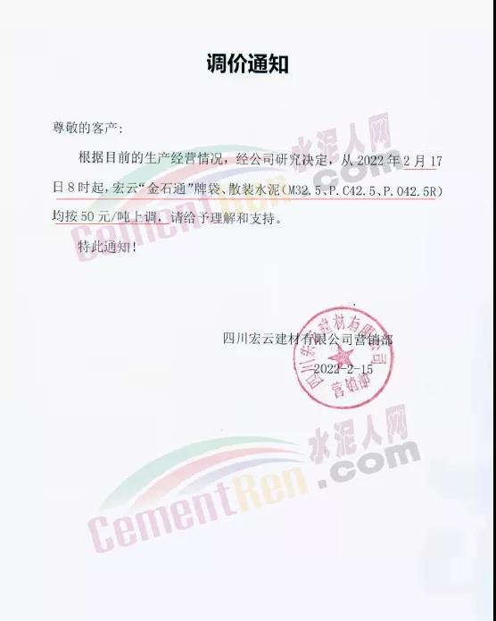 四川宏云建材有限公司營(yíng)銷部通知,根據(jù)目前的生產(chǎn)經(jīng)營(yíng)情況,經(jīng)公司研究決定,從2022年2月17日8時(shí)起,宏云“金石通”牌袋、散裝水泥(M32.5、P.C42.5、P.O42.5R)均按50元/噸上調(diào)。