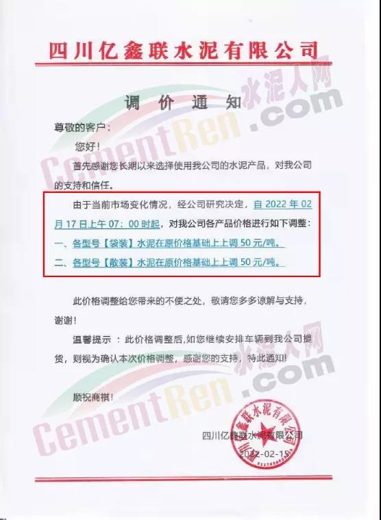 四川億鑫聯(lián)水泥有限公司通知,由于當(dāng)前市場(chǎng)變化情況,經(jīng)公司研究決定,自2022年2月17日上午7時(shí)起,對(duì)公司各產(chǎn)品價(jià)格進(jìn)行調(diào)整。各型號(hào)水泥在原價(jià)格基礎(chǔ)上上調(diào)50元/噸。