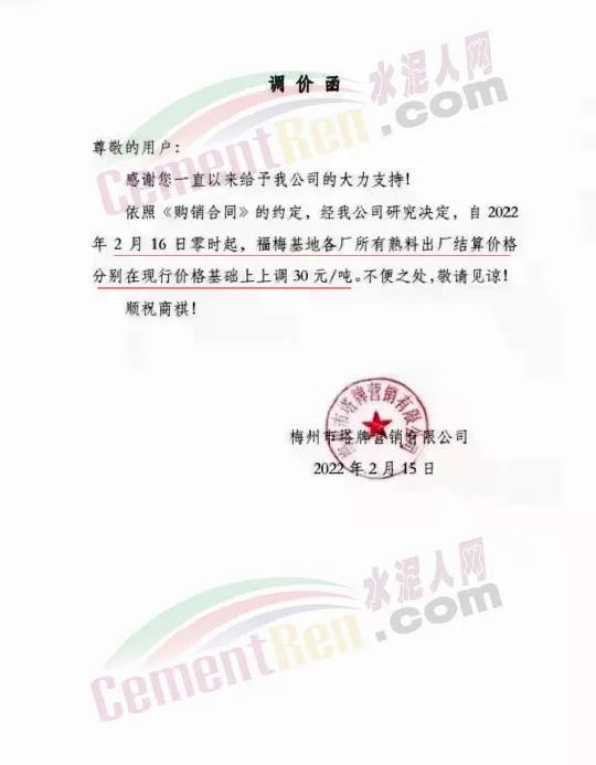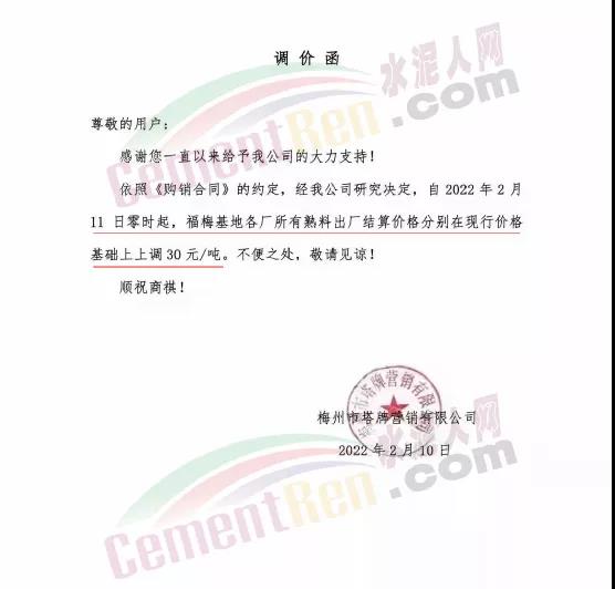 廣東梅州塔牌水泥通知自2022年2月16日零時(shí)起,福梅基地各廠所有熟料出廠結(jié)算價(jià)格分別在現(xiàn)行價(jià)格基礎(chǔ)上上調(diào)30元/噸。節(jié)后兩次調(diào)漲累計(jì)漲60元/噸。