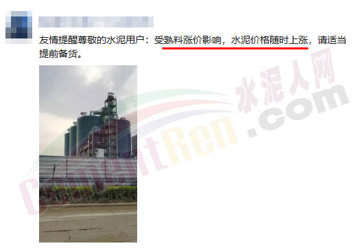 日前,長三角區(qū)域一貿易商發(fā)消息提醒用戶,受熟料漲價影響,水泥價格隨時上漲,請適當提前備貨。