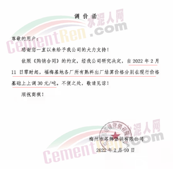 塔牌營銷公司漲價通知