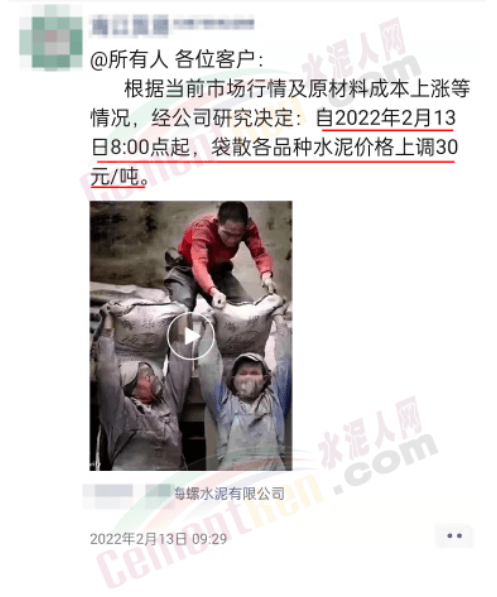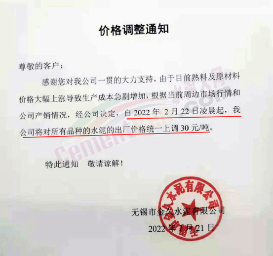 2月22日,江蘇無錫金久水泥通知上調水泥價格30元/噸。