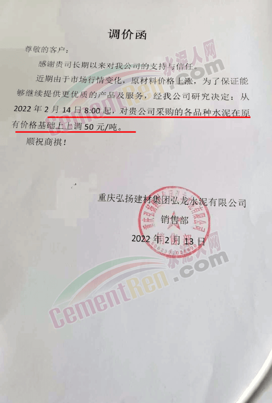 弘龍水泥漲價通知