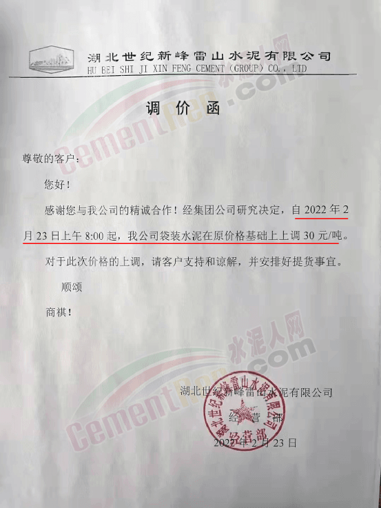 湖北世紀新峰雷山水泥有限公司通知,2月23日上午8時起,公司袋裝水泥在原價基礎上上調30元/噸。