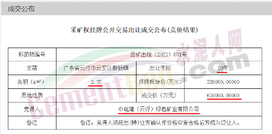 日前,中電建(云浮)綠色礦業(yè)有限公司以61億天價拍下云浮市云安區(qū)都楊鎮(zhèn)觀音山礦區(qū)建筑用花崗巖礦采礦權(quán),刷新了2022年礦權(quán)出讓記錄,這也意味著海螺水泥又一次痛失“采礦權(quán)”。