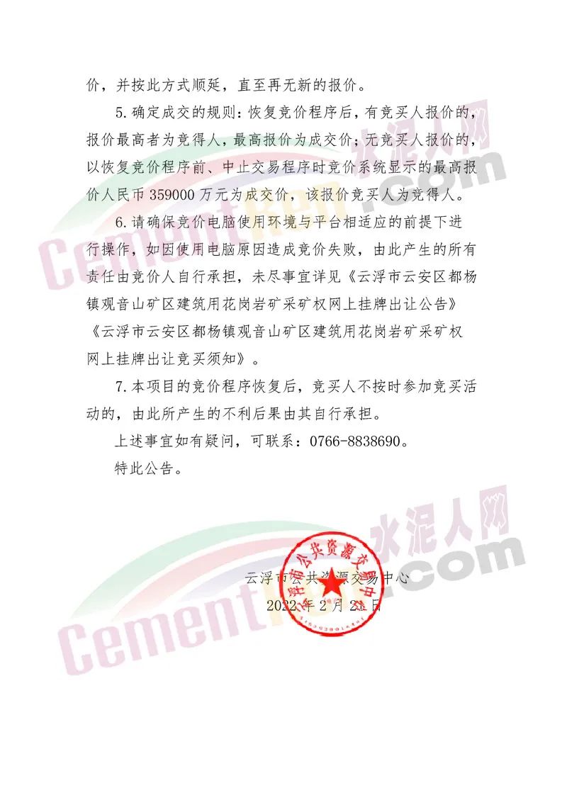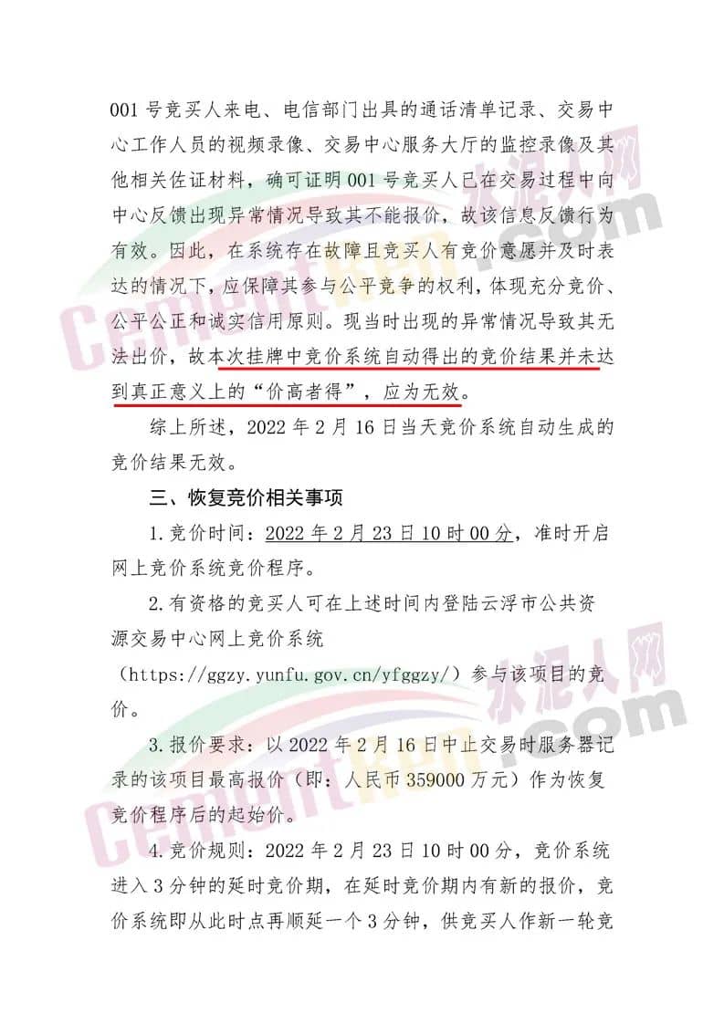 云浮市公共資源交易中心《關(guān)于恢復(fù)云自然資礦交出告字(2021〕1號采礦權(quán)出讓項目競價程序的公告》稱,經(jīng)查明001號競買人在競價過程中出現(xiàn)不能正常報價的原因是競價系統(tǒng)出現(xiàn)故障。2022年2月16日當(dāng)天競價系統(tǒng)自動生成的競價結(jié)果無效。