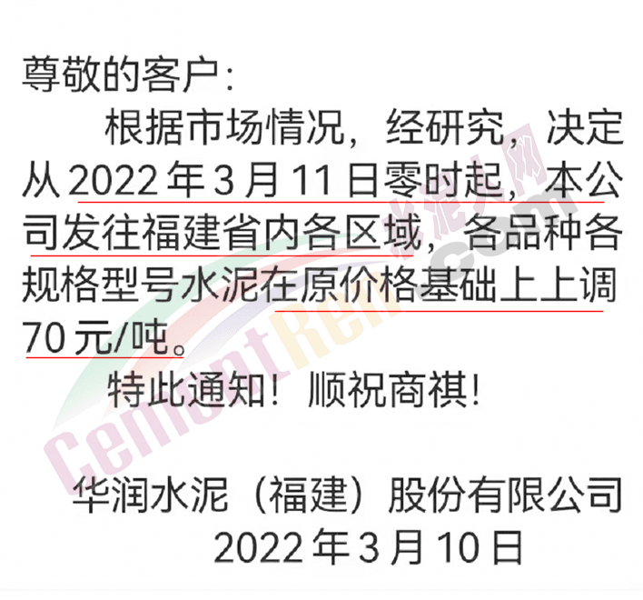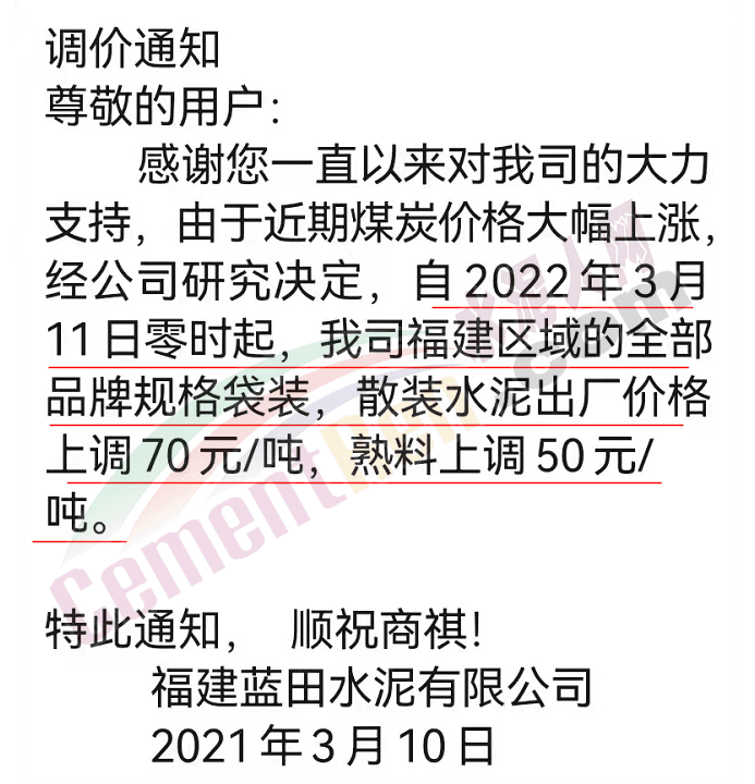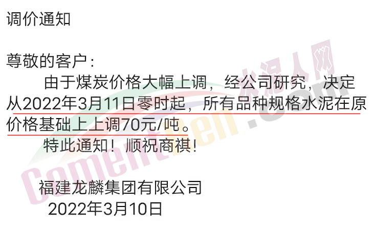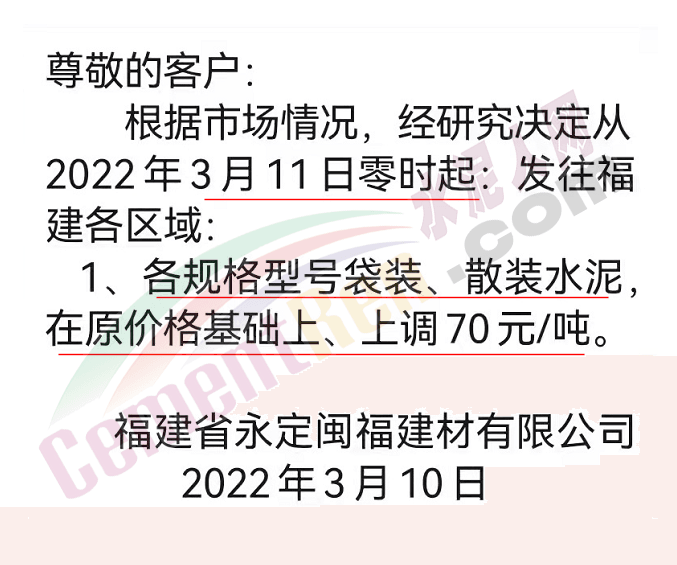 因原材料成本大幅上漲,根據(jù)目前市場行情,經(jīng)公司研究決定,自2022年3月11日零時起我司發(fā)往各區(qū)域的各品種各型號水泥出廠單價上調(diào)70元/噸 。