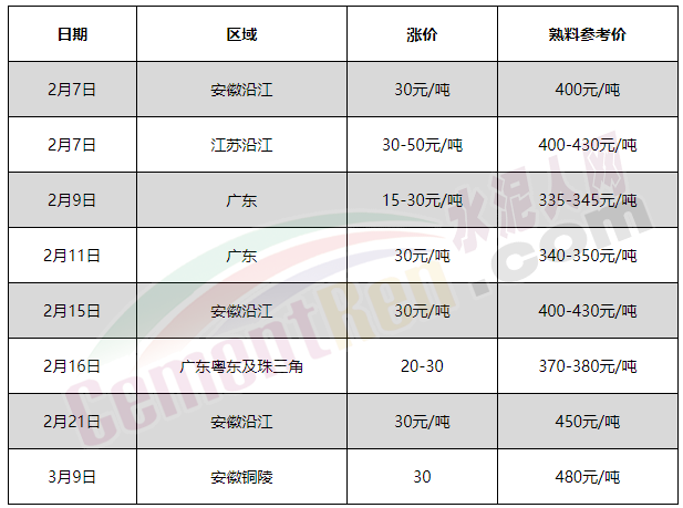 ?四川成都區(qū)2月份先后兩次下跌80-90元/噸,近期上調(diào)60元/噸;云南西雙版納2月內(nèi)漲50元/噸,跌30-50元/噸;江蘇南通漲20-30元/噸,跌10-20元/噸;河南鄭州漲30元/噸,跌50元/噸;上海漲30元/噸,跌15-30元/噸……