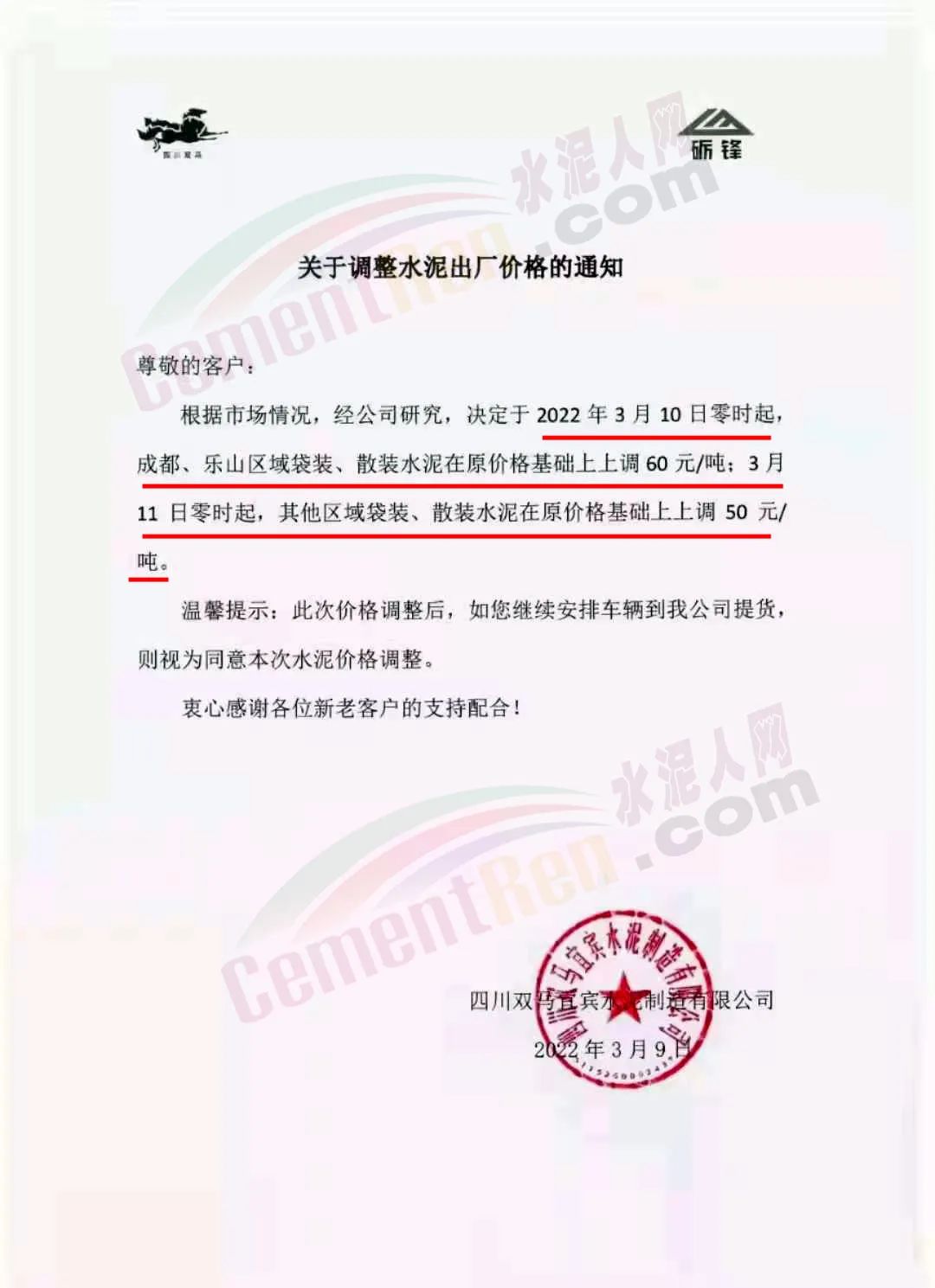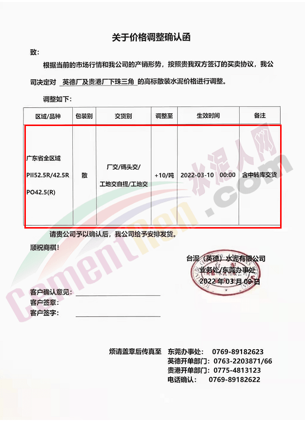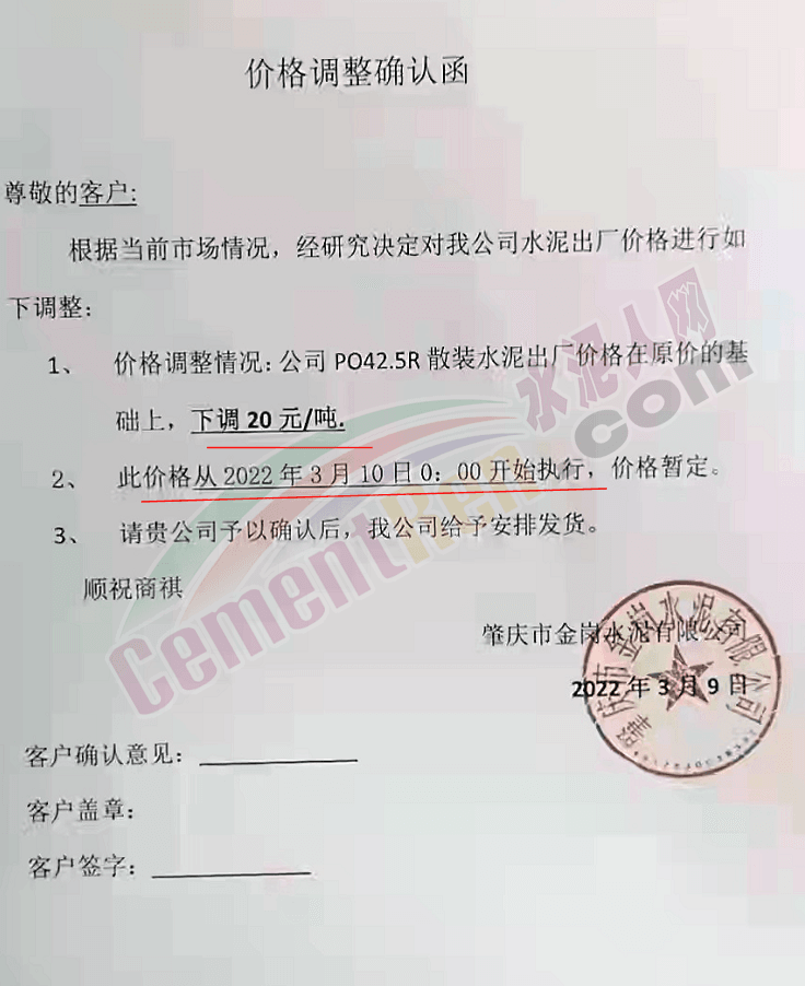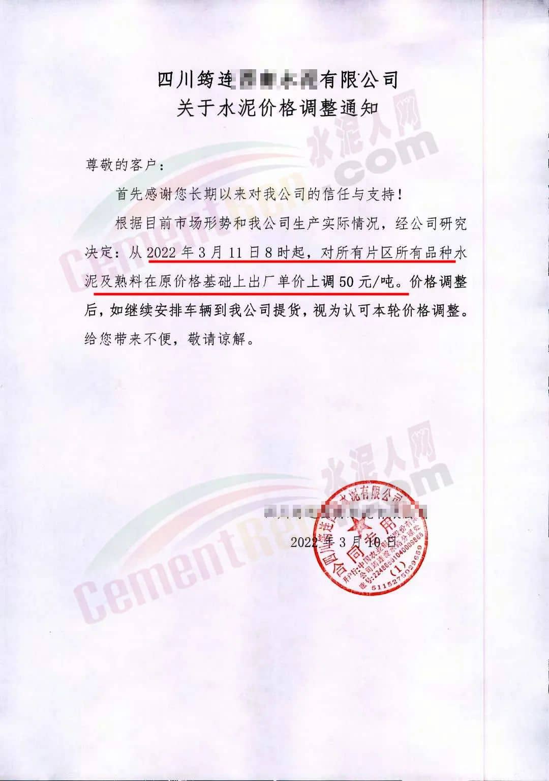 基于目前市場行情,結合我司實際情況,經(jīng)我公司研究決定,自2022年03月11日零時起,我公司發(fā)往全區(qū)域的各品牌、品種袋裝、散裝水泥、熟料的出廠價格,在原有基礎上上調(diào): 70元/噸。