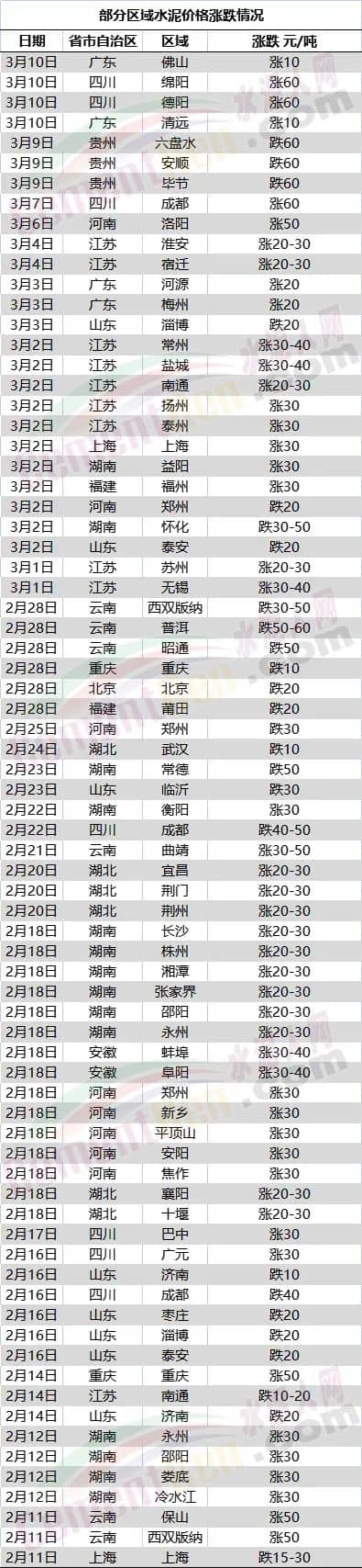 3月10日福建華潤水泥、藍田水泥、永定閩福建材、永安謀成水泥、福建金牛水泥、龍麟集團、鑫城水泥、大縣新巖、春馳新豐等水泥企業(yè)通知自11日起上調(diào)水泥價格70元/噸, 藍田水泥熟料同步上調(diào)50元/噸。
