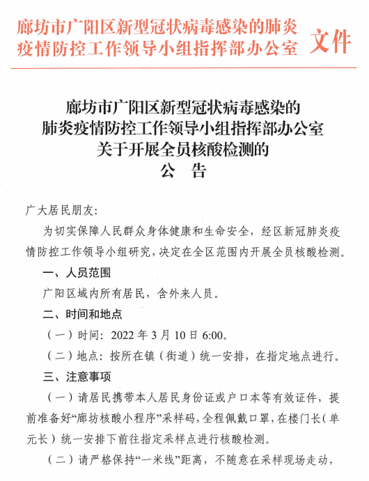 河北廊坊開發(fā)區(qū)決定在全區(qū)范圍內(nèi)開展全員核酸檢測。