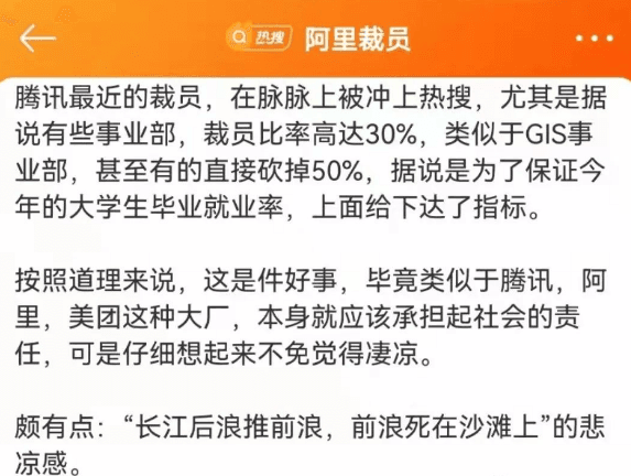 據(jù)水泥人網(wǎng)了解,近期阿里裁員、騰訊裁員迅速登錄熱門榜,騰訊預(yù)計(jì)裁員10~30%。而阿里旗下MMC事業(yè)群正計(jì)劃裁員,本次裁員數(shù)量約20%……現(xiàn)在的就業(yè)環(huán)境更是讓人后背發(fā)涼。