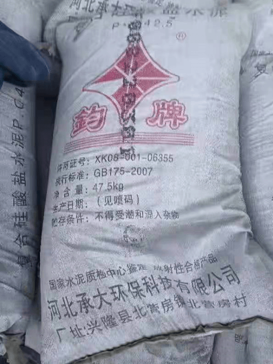 一款42.5水泥,標(biāo)稱生產(chǎn)企業(yè)為河北承大環(huán)??萍加邢薰?,凈含量47.5kg。生產(chǎn)許可證編號標(biāo)稱為XK08-001-06355。生產(chǎn)日期噴碼顯示“220301”字樣。