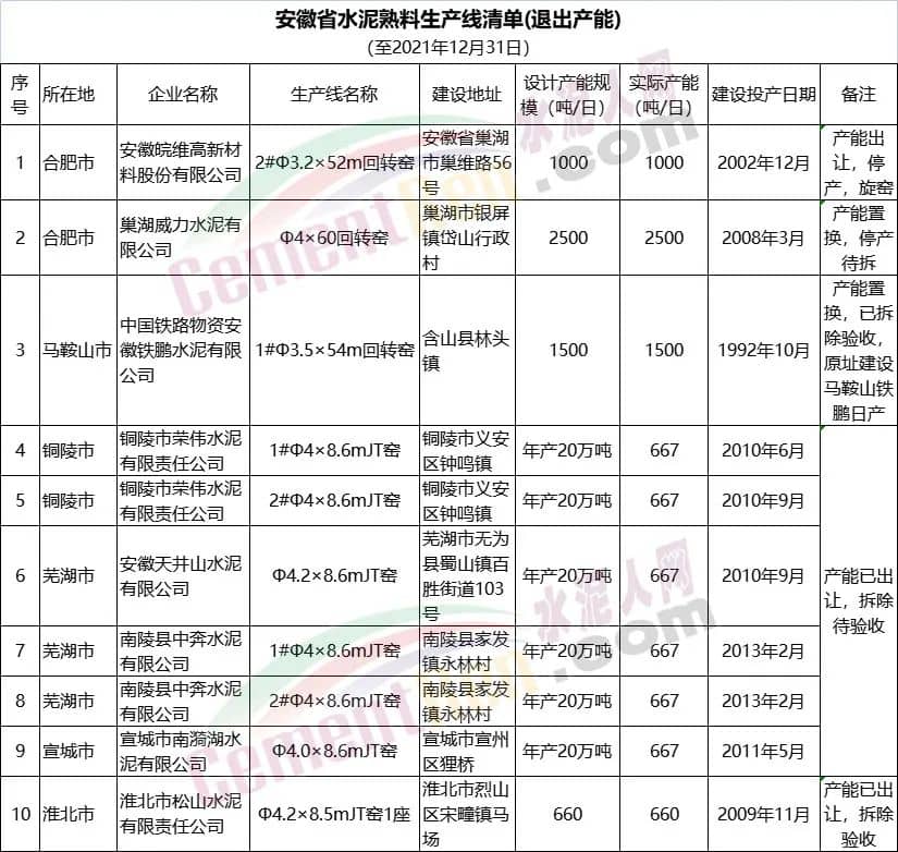 海螺水泥的大本營(yíng)安徽省截止2021年12月31日共退出10條生產(chǎn)線,退出生產(chǎn)線建成投產(chǎn)日期從1992年至2013年均有,其中包括7條JT窯生產(chǎn)線,退出產(chǎn)能合計(jì)289.8萬噸/年。