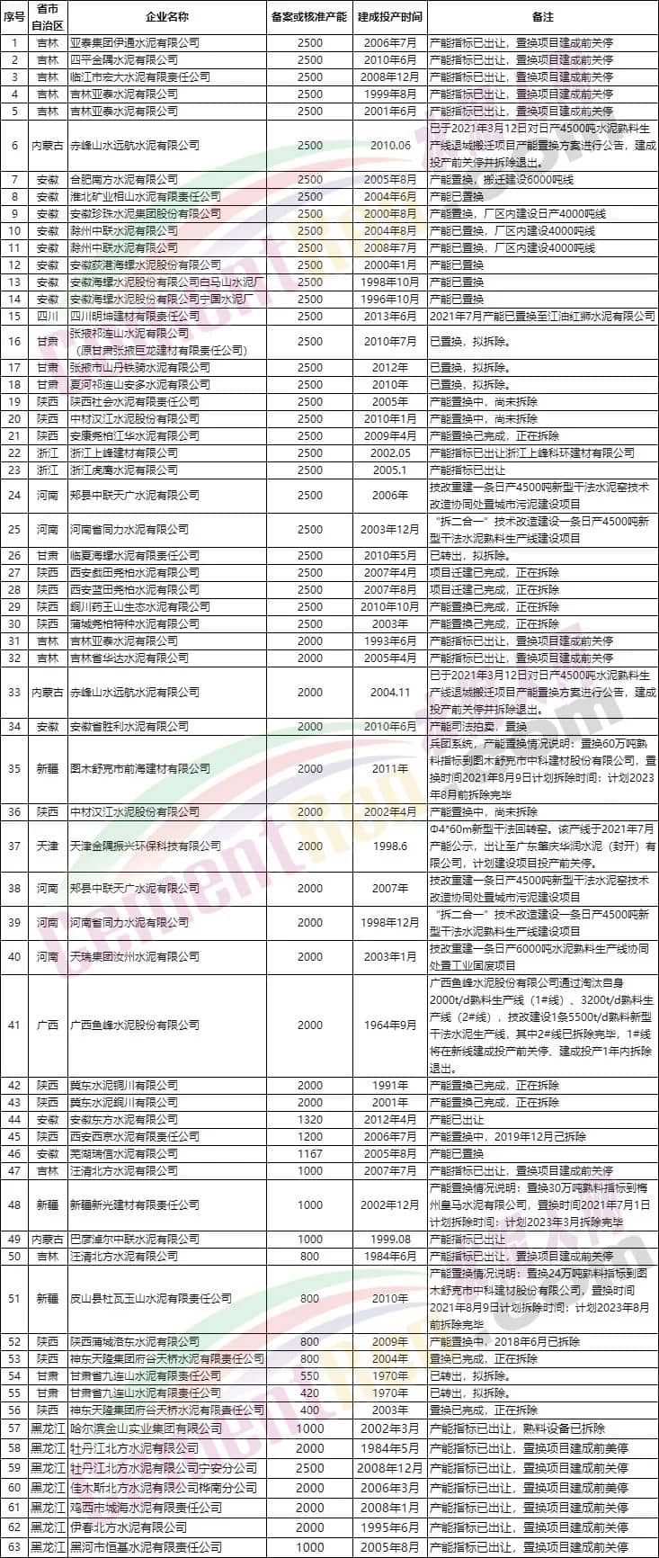 近期,寧夏、內(nèi)蒙、新疆、江蘇、浙江、山東、安徽 、云南、四川、河南、吉林、廣西、甘肅、陜西、天津、河北、貴州、黑龍江等18個(gè)省市自治區(qū)分別發(fā)布了截止2021年12月31日的水泥熟料生產(chǎn)線清單。部分省份公布的清單中不僅明確生產(chǎn)線設(shè)計(jì)產(chǎn)能、實(shí)際產(chǎn)能、窯規(guī)格尺寸以及建成投產(chǎn)時(shí)間。還有部分省市還將產(chǎn)能置換項(xiàng)目以及新建、在建項(xiàng)目也都明確標(biāo)注出來了。