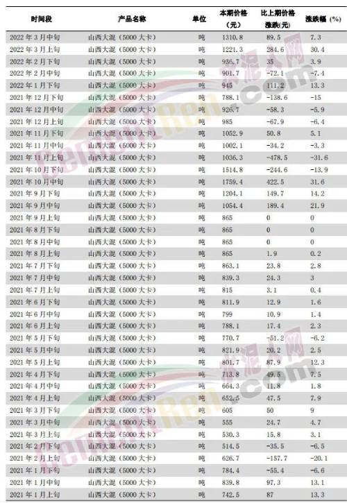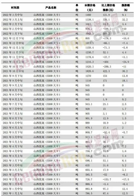 據(jù)水泥人網(wǎng)了解,煤價每變動100元,對水泥成本影響大約在10-15元/噸。以水泥企業(yè)燒成系統(tǒng)常用5000-5500大卡混煤為例,國家統(tǒng)計局?jǐn)?shù)據(jù),流通領(lǐng)域山西大混(5000大卡)2021年1月上旬為742.5元/噸,今年3月中旬為1310.8元/噸,上漲了568.3元/噸,漲幅約77%;山西優(yōu)混(5500大卡)2021年1月上旬為786.5元/噸,2022年3月中旬為1460元/噸,上漲了673.5元/噸,漲幅86%。