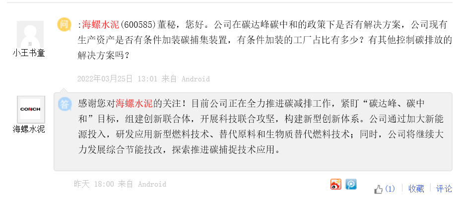 海螺水泥表示,目前公司正在全力推進(jìn)碳減排工作,緊盯“碳達(dá)峰、碳中和”目標(biāo),組建創(chuàng)新聯(lián)合體,開展科技聯(lián)合攻堅,構(gòu)建新型創(chuàng)新體系。公司通過加大新能源投入,研發(fā)應(yīng)用新型燃料技術(shù)、替代原料和生物質(zhì)替代燃料技術(shù);同時,公司將繼續(xù)大力發(fā)展綜合節(jié)能技改,探索推進(jìn)碳捕捉技術(shù)應(yīng)用。