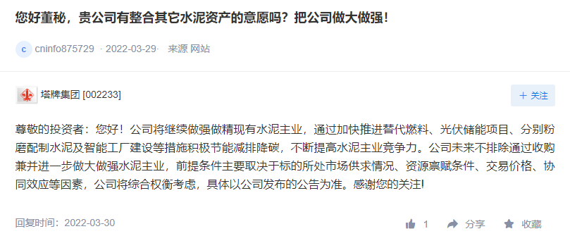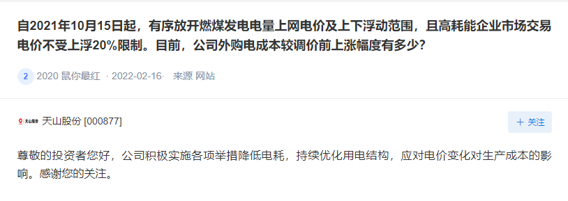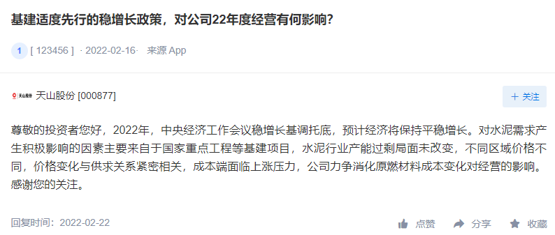 在應(yīng)對需求減少,成本增加方面,天山股份表示,2022年,中央經(jīng)濟(jì)工作會議穩(wěn)增長基調(diào)托底,預(yù)計經(jīng)濟(jì)將保持平穩(wěn)增長。對水泥需求產(chǎn)生積極影響的因素主要來自于國家重點工程等基建項目,水泥行業(yè)產(chǎn)能過剩局面未改變,不同區(qū)域價格不同,價格變化與供求關(guān)系緊密相關(guān),成本端面臨上漲壓力,公司力爭消化原燃材料成本變化對經(jīng)營的影響。針對電價上漲將積極實施各項舉措降低電耗,持續(xù)優(yōu)化用電結(jié)構(gòu),應(yīng)對電價變化對生產(chǎn)成本的影響。