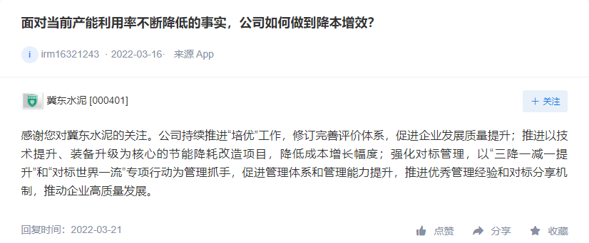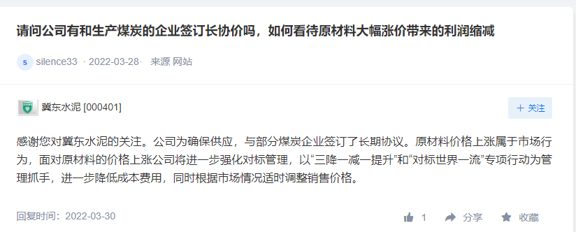 冀東水泥表示,公司為確保供應(yīng),與部分煤炭企業(yè)簽訂了長期協(xié)議。原材料價格上漲屬于市場行為,面對原材料的價格上漲公司將進(jìn)一步強(qiáng)化對標(biāo)管理,以“三降一減一提升”和“對標(biāo)世界一流”專項行動為管理抓手,進(jìn)一步降低成本費用,同時根據(jù)市場情況適時調(diào)整銷售價格。公司將推進(jìn)以技術(shù)提升、裝備升級為核心的節(jié)能降耗改造項目,降低成本增長幅度。