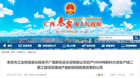 日前廣西來(lái)賓市工業(yè)和信息化局發(fā)布公告稱,已于2022年3月1日,組織廣西水泥行業(yè)協(xié)會(huì)專家組到廣西新東運(yùn)水泥有限公司已建成的5000t/d熟料水泥生產(chǎn)線二期工程項(xiàng)目產(chǎn)能進(jìn)行現(xiàn)場(chǎng)核實(shí)并出具了核查一致結(jié)果公告。
