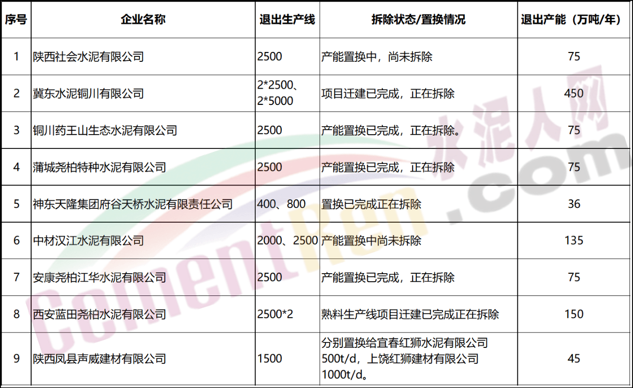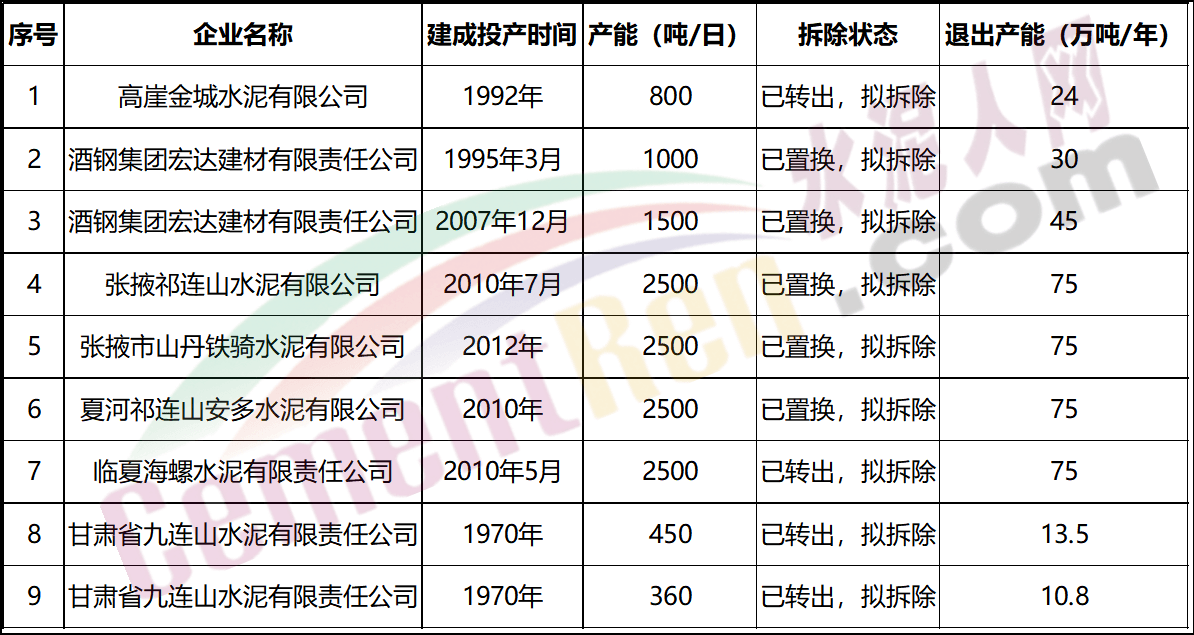 甘肅已置換轉(zhuǎn)出,擬拆除產(chǎn)能423.3萬噸/年,共9條熟料生產(chǎn)線