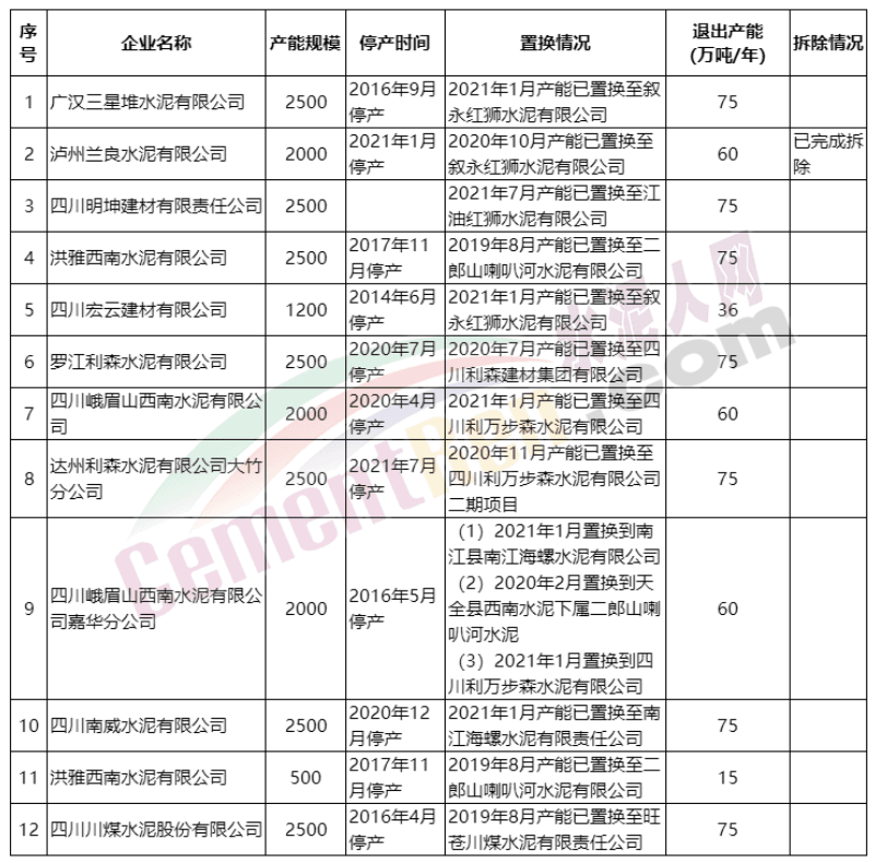 四川省12條熟料生產(chǎn)線置換拆除及擬拆除產(chǎn)能共756萬噸/年