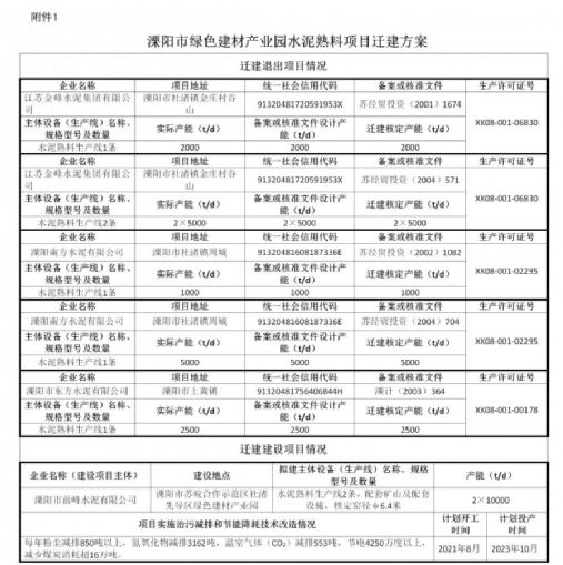據(jù)水泥人網(wǎng)了解,江蘇省工信廳曾于2021年8月5日公告,溧陽市計劃搬遷5條水泥熟料生產(chǎn)線在溧陽市綠色建材產(chǎn)業(yè)園建設(shè)8000t/d和10000t/d水泥熟料生產(chǎn)線各一條。
