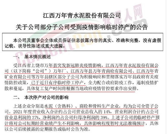 同期,上市公司萬年青發(fā)公告稱,受疫情影響,旗下多家子公司停工停產(chǎn)。停產(chǎn)所涉及的子公司占企業(yè)2021年度營(yíng)業(yè)總收入的14%,營(yíng)業(yè)利潤(rùn)約占總營(yíng)業(yè)潤(rùn)的27%,凈利潤(rùn)約占公司歸母凈利潤(rùn)的39%。臨時(shí)停產(chǎn)將對(duì)公司短期經(jīng)營(yíng)業(yè)績(jī)產(chǎn)生不利影響,具體影響程度暫時(shí)無法準(zhǔn)確預(yù)計(jì)。