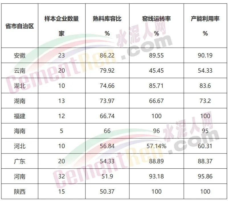 據(jù)水泥人網(wǎng)五月初調(diào)研數(shù)據(jù)顯示,安徽、云南、湖北、湖南、福建、海南、河北、廣東、河南、陜西等十余個(gè)省份,熟料庫(kù)容比均在50%以上,其中安徽、云南等省份達(dá)到了80%左右。產(chǎn)能利用率方面僅福建和陜西達(dá)到了100%。