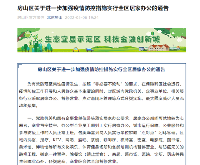 房山區(qū)發(fā)布了進(jìn)一步加強(qiáng)疫情防控措施實(shí)行全區(qū)居家辦公的通告,商業(yè)寫字樓宇、辦公型企業(yè)員工原則上實(shí)行居家辦公,各類確需到崗人員實(shí)行單位家庭“點(diǎn)對(duì)點(diǎn)”閉環(huán)管理。