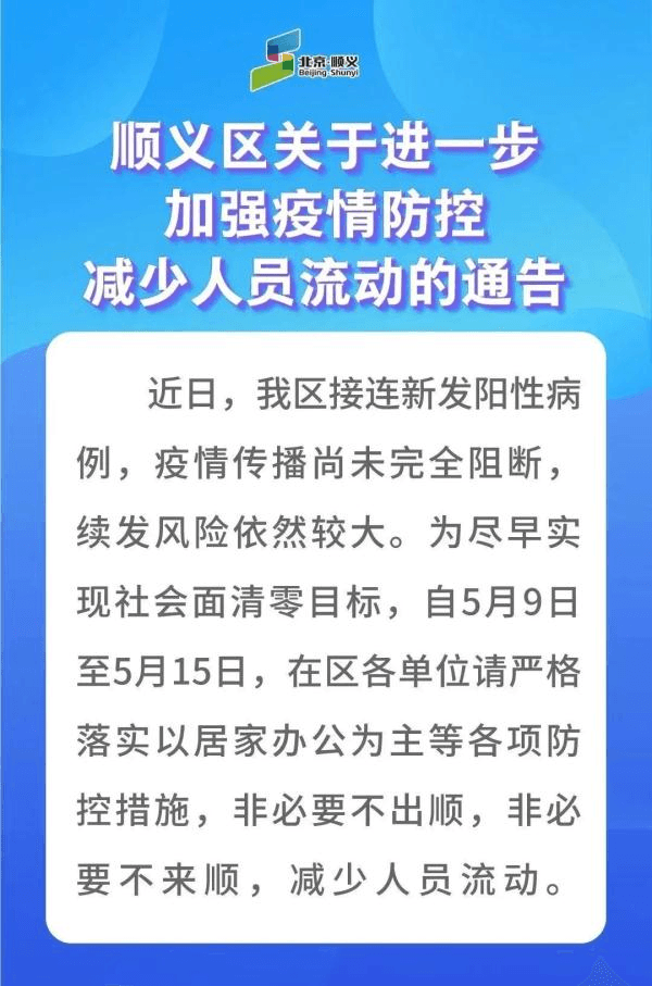自5月9日至5月15日,順義區(qū)各單位嚴(yán)格落實(shí)以居家辦公為主的各項(xiàng)防控措施,非必要不出順,非必要不來順,減少人員流動(dòng)。通告要求,居住在朝陽區(qū)和房山區(qū)、工作在順義區(qū),或居住在順義區(qū)、工作在朝陽區(qū)、房山區(qū)的人員,一律居家辦公;各單位確需到崗的,將上崗率嚴(yán)格控制在50%以內(nèi),實(shí)行單位-家庭“點(diǎn)對(duì)點(diǎn)”閉環(huán)出行方式為主,最大限度減少流動(dòng)。